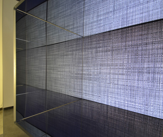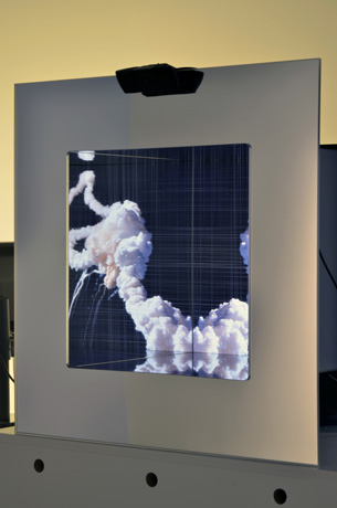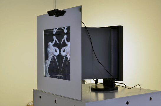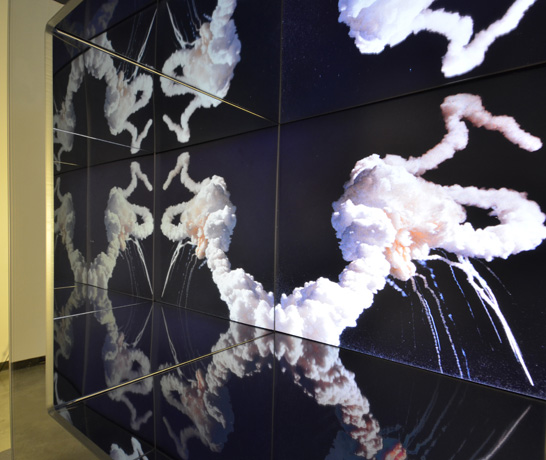 Challenger On January 28, 1986, the main fuel tank of the NASA Space Shuttle Challenger exploded mid flight, causing the breakup of the shuttle and the deaths of all seven astronauts aboard. In the following weeks there was a growing public unease with TV news entities' repetitive broadcasts of the explosion. This discomfort reflected both a distaste for the gratuitous nature of the broadcasts, and an awareness that they were sustained by viewers' horrified fascination. In this piece, the pixels of an image of the shuttle’s explosion are displaced horizontally and vertically, line by line, devolving the image into a noisy and undulating cloud of light and dark. A video camera captures the movements of the viewer. As the viewer's movements continue, the lines of pixels return to their original positions, reconstituting the image of the disaster. A mirrored box surrounding the screen repeats the image infinitely.