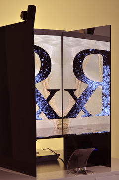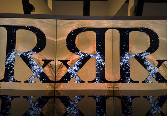 Retrograde The term "retrograde" has various implications regarding the study of the celestial bodies. As the position of Earth changes in relation to the other planets in the solar system, the planets sometimes appear us to stop and then move backwards across the night sky. To account for this motion in geo-centric astronomy, it was assumed that planets moved in odd looping orbits, as if they were orbiting invisible points in space while also orbiting earth. It wasn't until astronomers realized that the earth wasn't the center of the universe that the illusion of retrograde motion was accurately explained. In astrology, a planet in retrograde designates a weakness or lack of a quality normally associated with that planet. During retrograde cycles, astrologers often recommend behaviors and attitudes to compensate for deficiencies in their readers’ own pasts, in an effort to turn potentially negative experiences into positive, constructive ones. In this piece, a screen displays an image taken by a NASA rover looking back at its own tracks on the surface of Mars. Over laying this image is a negative space defined by the astrological symbol for retrograde (Rx). Within this space are starry images tracking the motion of the viewer. These motion images are captured in a short loop that plays continuously backwards and forwards. As the viewer approaches the screen, the Rx symbol is inverted in varying degrees, so that when the viewer is closest to the screen, the symbol is inverted completely. Adjacent perpendicular mirrors reflect and reverse the image to the right and left so that it can be read normally. Thus the viewer reads the image my moving backwards and forwards in front of the piece, as well as looking side to side, reflecting the content of the imagery.